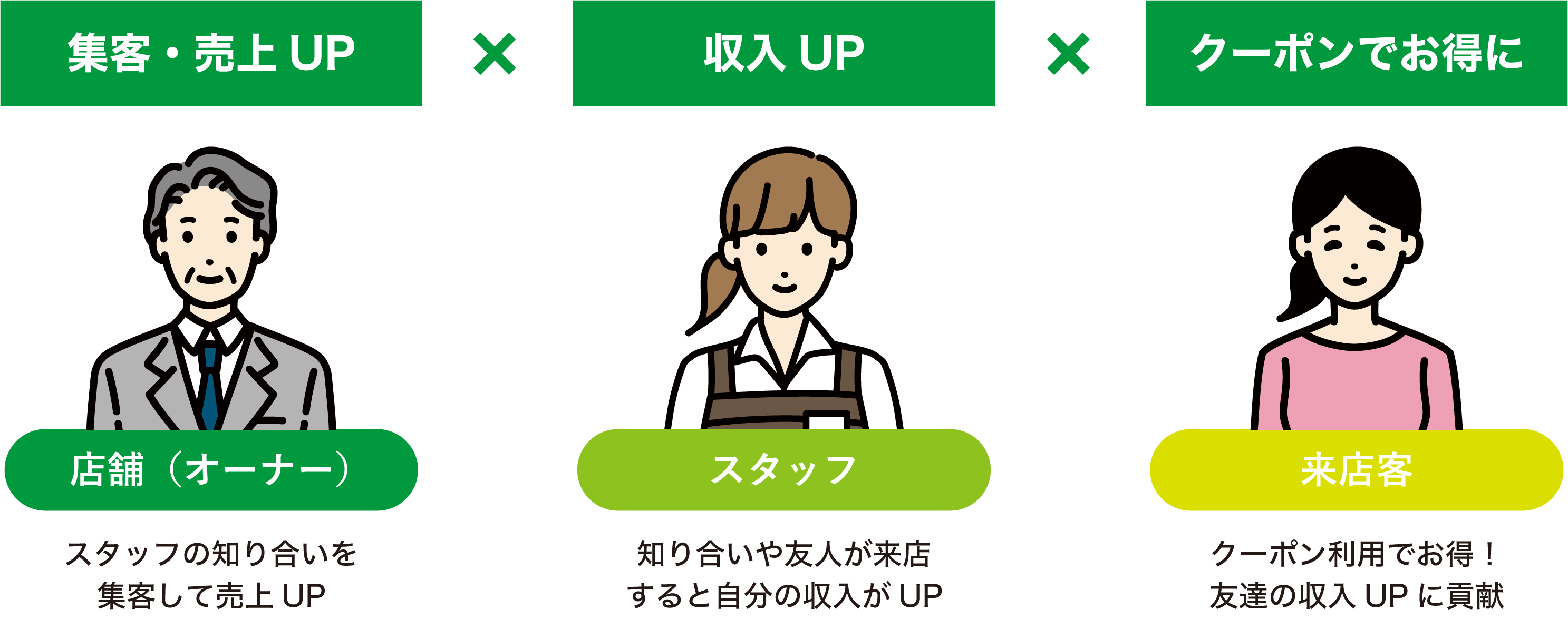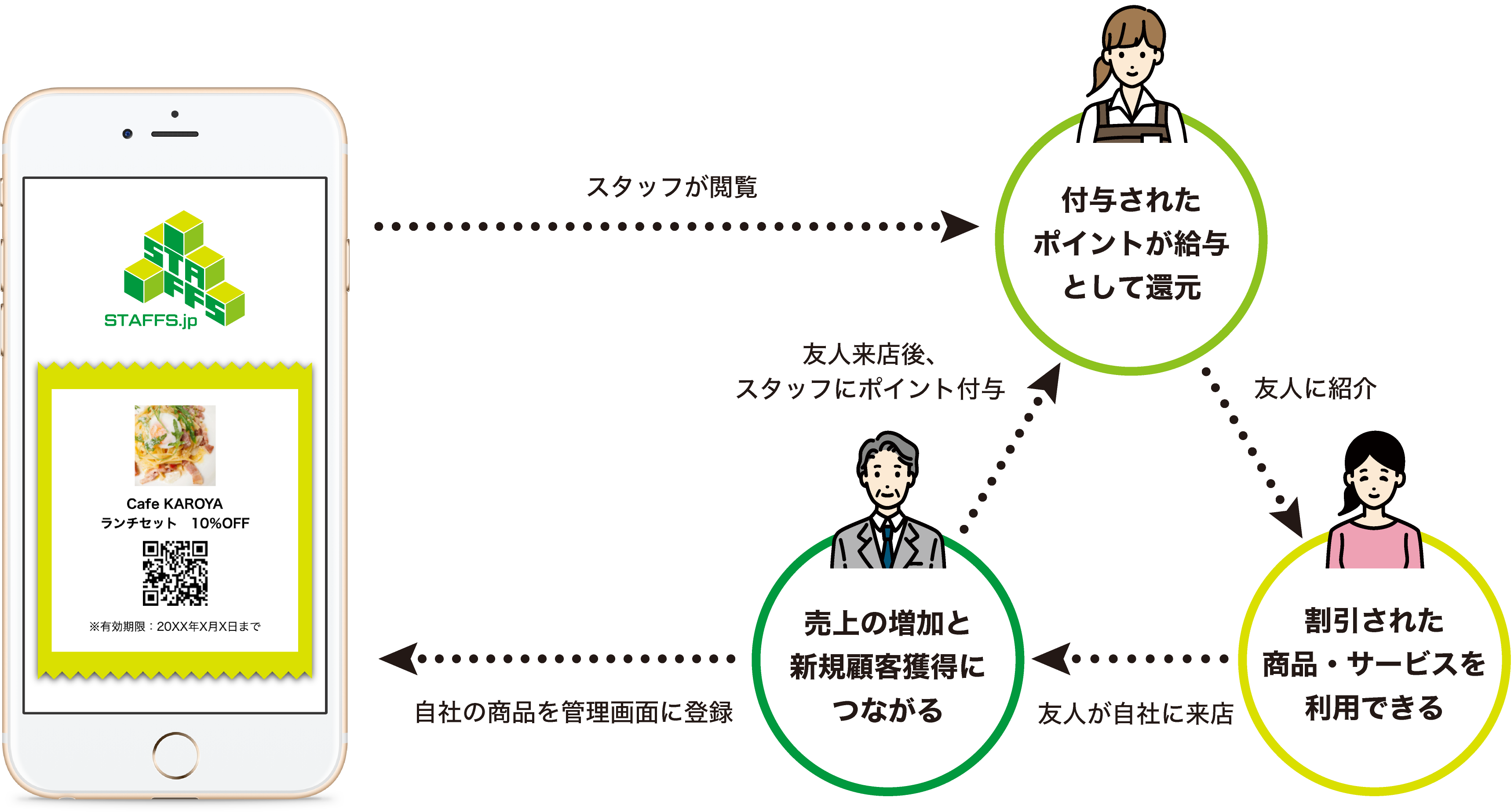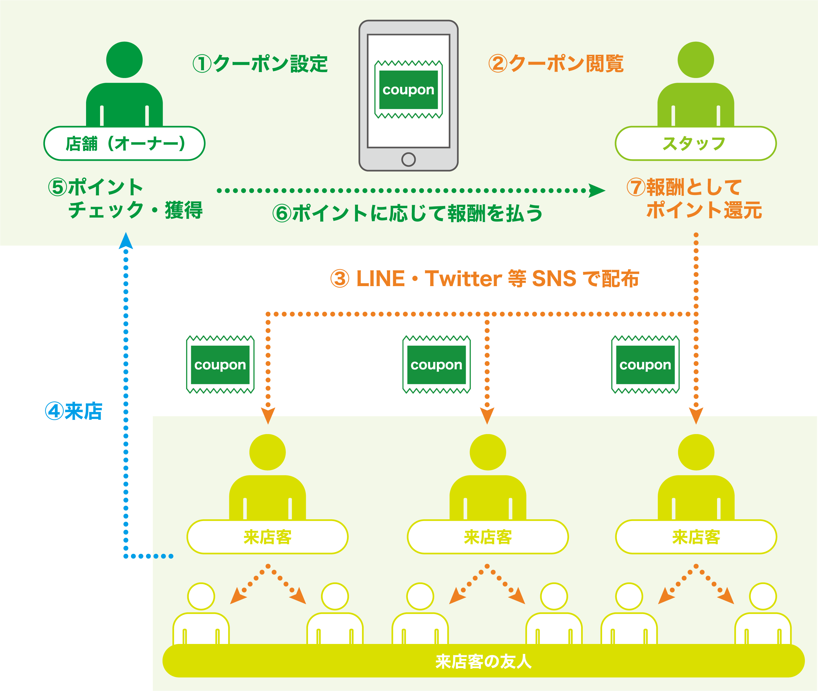 友人が来店し、クーポンを利用すると、紹介したスタッフにポイントが付与されます。
